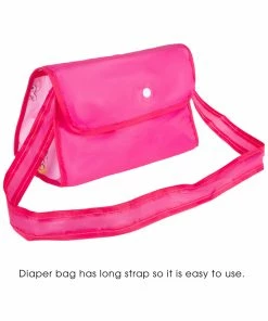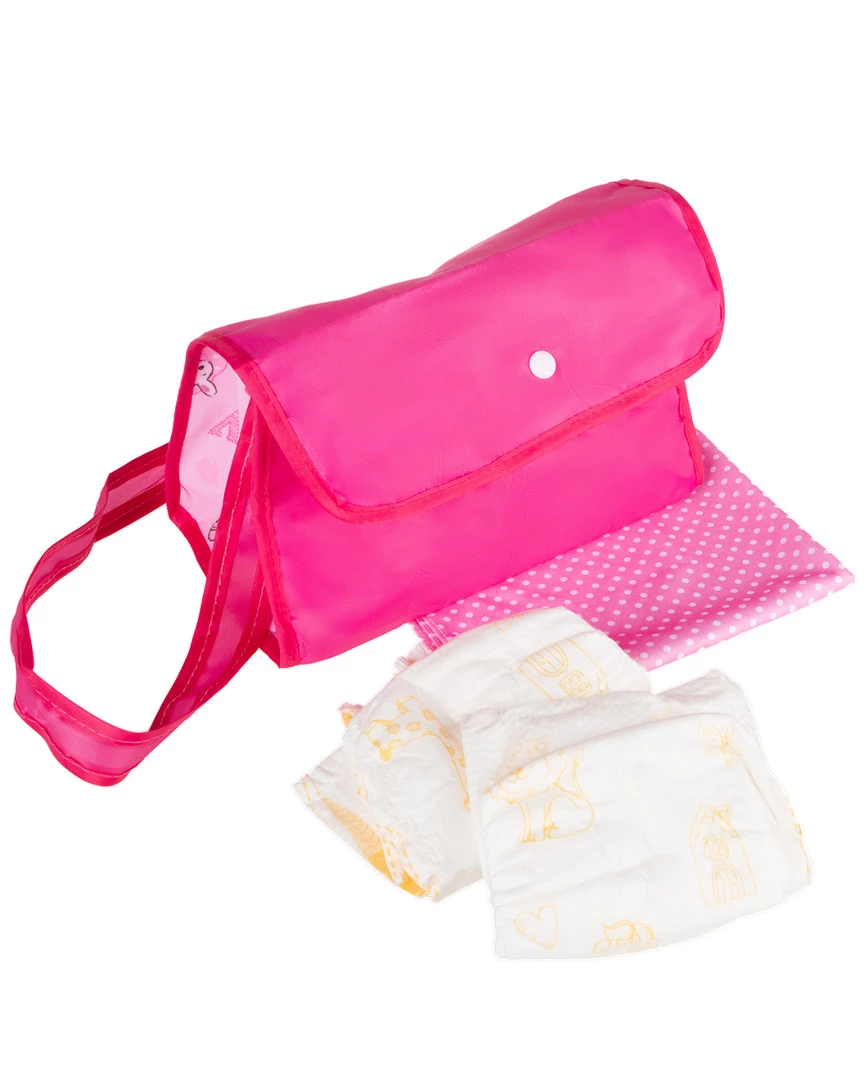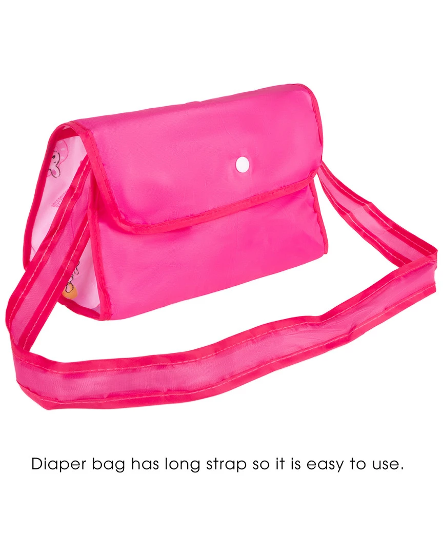 - Cultivate pretend play and provide a realistic experience for your little ones with the Baby Doll Diaper Bag by Hey! Play! This nylon diaper bag has a long strap for easy portability and includes a soft blanket that can be used as a changing pad and two reusable diapers with hook and loop closures. The pink diaper bag is the ultimate accessory for all your kids favorite dolls accessories!