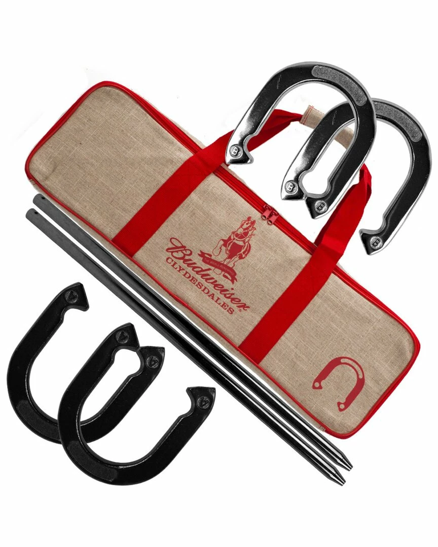 - The Budweiser Horseshoes Game Set is sure to be a hit at your next party, event, or backyard barbecue! With a carrying case that features the Budweiser Clydesdales logo conveniently included, you can easily bring this fun lawn game along anywhere. Crafted from professional grade materials, this set is made to last. Your friends and family will enjoy hours of fun with this engaging game!