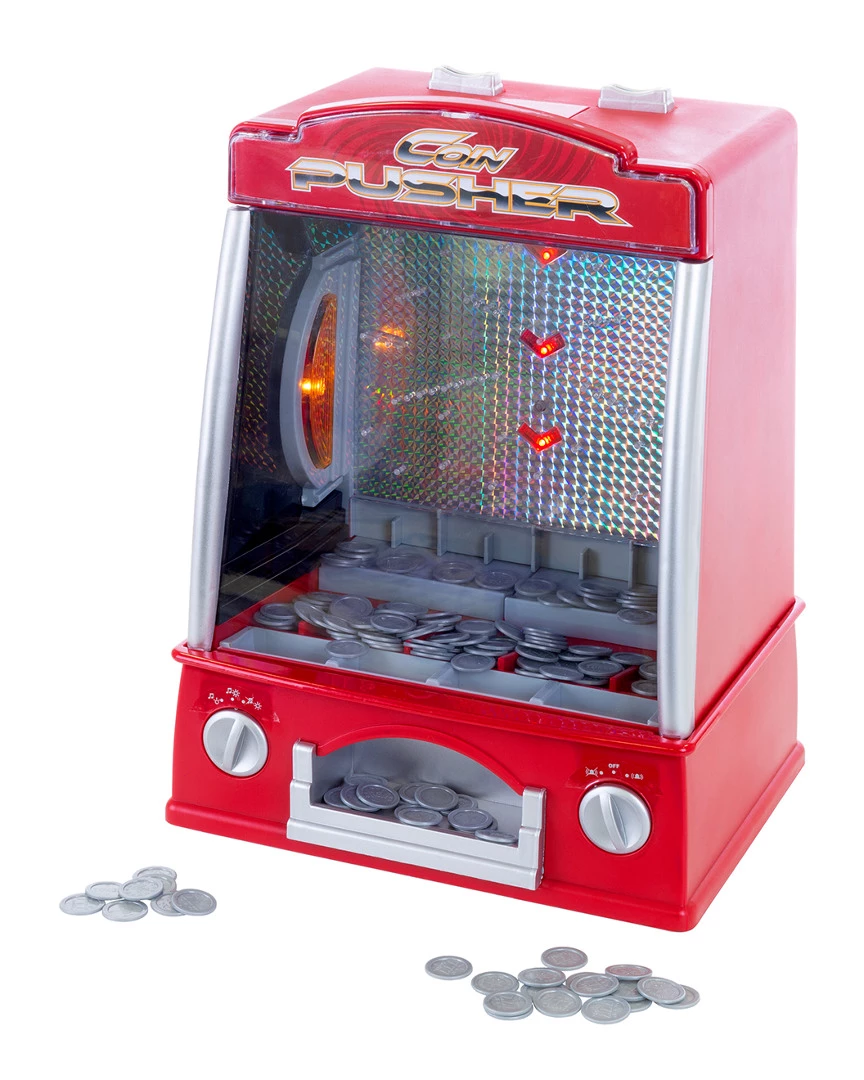 - Bring home the magic of old school arcades with the Table Top Coin Pusher by Hey! Play! This machine is fun for kids and adults alike. It includes 150 plastic tokens and can be used with real pennies and dimes! The unit is powered by 4 D-cell batteries and is made of durable ABS plastic so it is strong enough to stand up to daily play or use in school carnivals or casino themed parties. There are switches on the front to control the lights, music and tilt alarm. The coin slots also move back and forth for an extra layer of challenge. The top of the machine features a hatch for filling the unit with tokens or coins before its first use, and the front tray slides forward for easier prize retrieval. This machine would fit into any home arcade, game room or mancave.