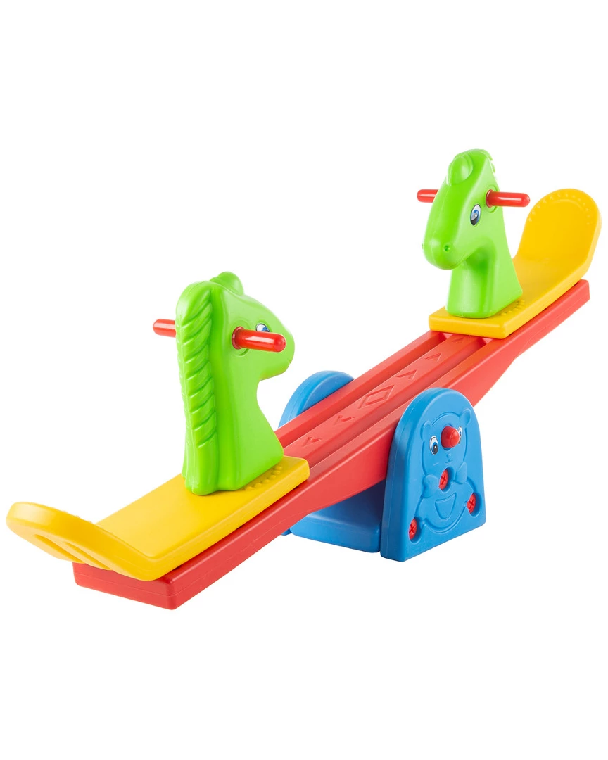 - Your little ones will have fun, rain or shine, with the Indoor and Outdoor Seesaw by Hey! Play! This teeter totter is made of durable, high-density polyethylene. This makes it strong enough to handle daily play and to stand up to almost any weather conditions, so it will last for years to come. The seats feature raised ends to keep children from sliding backwards and easy-grip handles to keep them safe as they play. The bright colors and fun animal shapes will encourage boys and girls to play, and the up-and-down mechanics help develop balance and coordination. It will also teach children how to work with others to use the teeter totter. This seesaw is sized just right to be a great addition to an outdoor playground or inside a playroom or daycare center. The lightweight and compact design makes it easy to move around so kids can play anywhere.