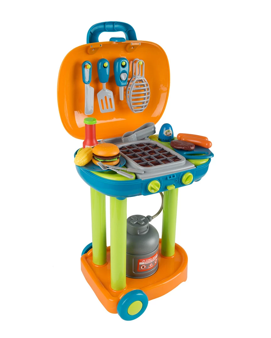 - Give your aspiring grill master the excitement of make-believe barbecues with the pretend play Grill BBQ Playset, with Food and Tools by Hey! Play!. This playset ignites learning and interaction in toddlers and kids and sparks your little chefs imagination with a variety of play foods, utensils, and accessories. The realistic sounds and lights on the grills grate inspires creativity, providing a unique way to play by simulating a life-like experience!