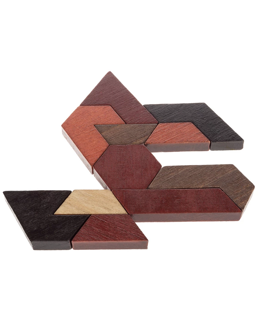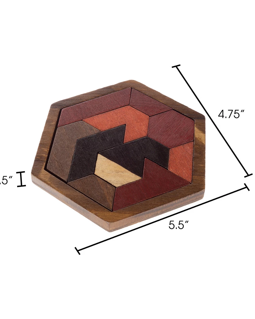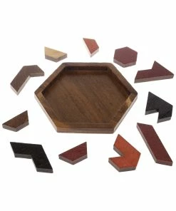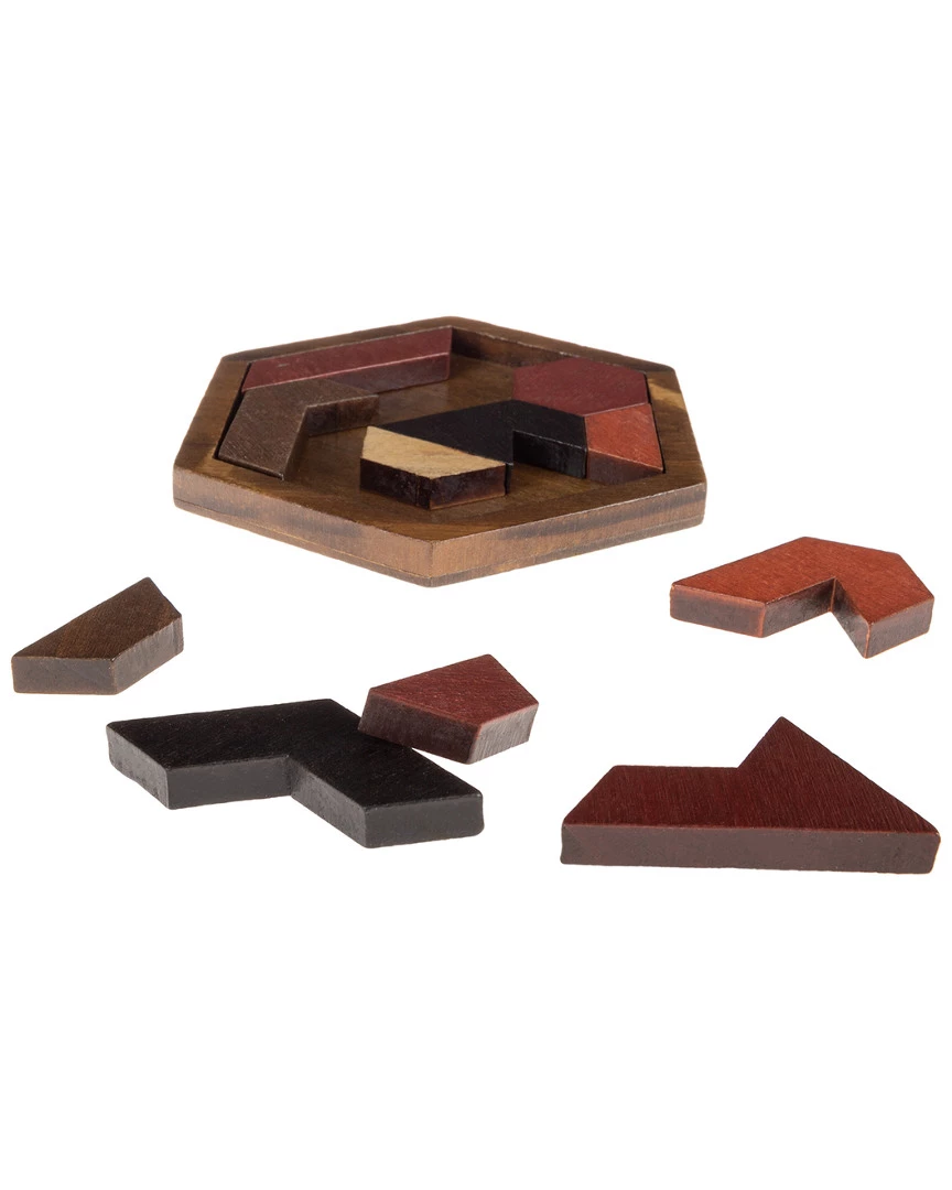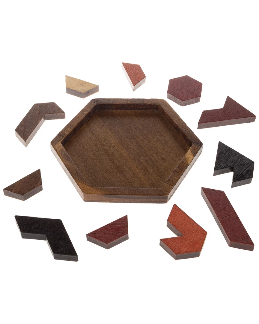 - Give your family a hands-on and engaging way to learn about spatial relations with the Hexagon Block Puzzle by Hey! Play! This classic wood tangram game includes 11 wood geometric shaped blocks that can be played inside or outside the included storage tray for endless building options and hours of fun! Each piece is made of durable beechwood to stand up to daily use either at home or in a classroom.
