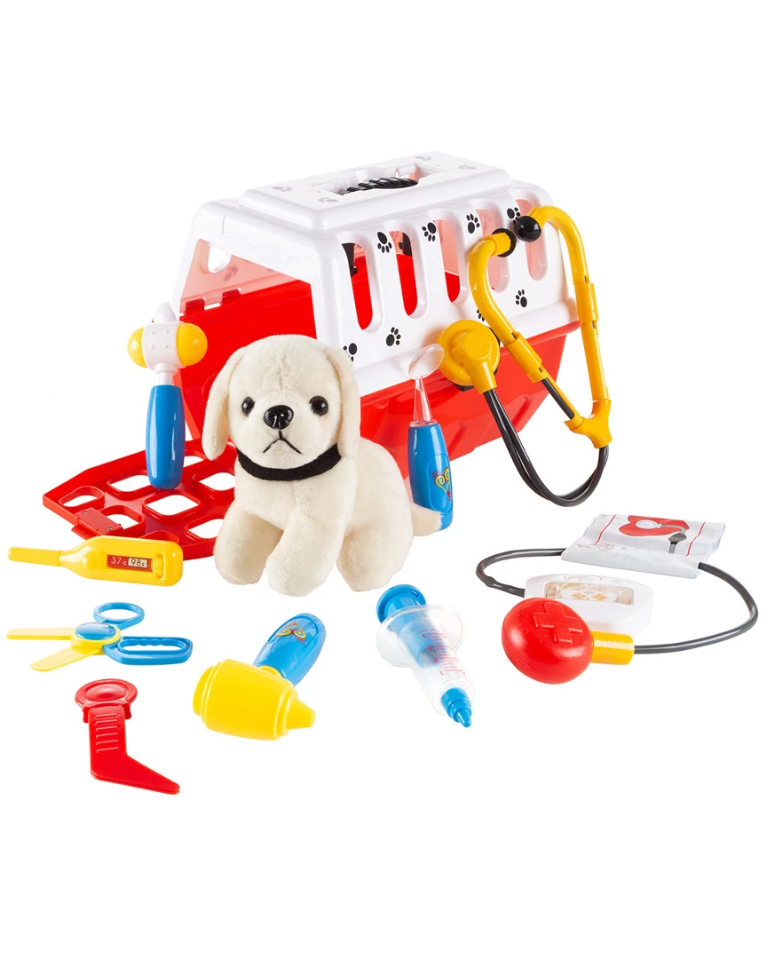 - Spark imagination and compassion with the Kids Veterinary Playset by Hey! Play! This complete 11-piece set comes with a plush toy dog, pet carrier, and animal medical tools including: blood pressure monitor, stethoscope, syringe, thermometer, scissors, reflex hammer, otoscope, small magnifier and tweezers. The kit encourages creativity and imagination and is fantastic for pretend play activities. Your little girl or boy will love playing veterinarian and will have hours of fun treating and caring for their all their stuffed animals!