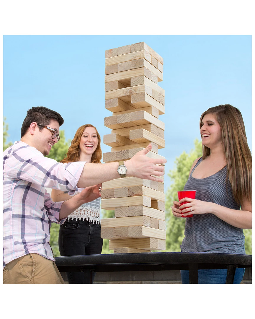 - The Classic Giant Wooden Blocks Tower Stacking Game by Hey! Play! takes a classic stacking game to new heights. The 54 wooden blocks are hand-crafted out of pinewood, and can stack over four feet tall. The dimensions of these blocks make this a truly jumbo game compared to other stacking games. With a nylon carrying case for easy storage, the game is perfect for backyard parties, picnics at the beach, or just about anywhere.
