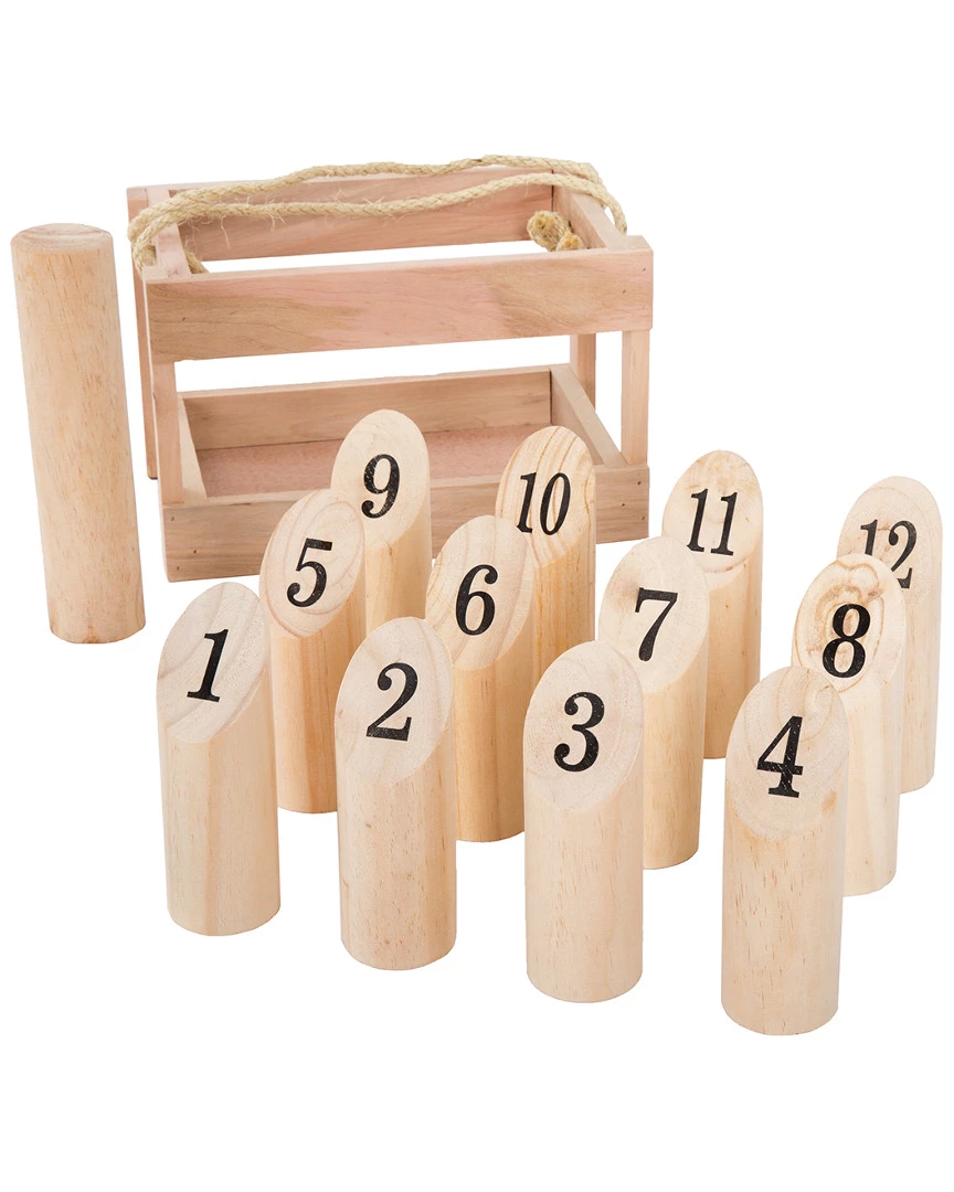 - The Hey! Play! Wooden Throwing Game is an exciting Finnish throwing game that is quickly gaining popularity in the US. It can be played on grass, gravel, sand, dirt, or just about any surface, and can be played by players of any age, making it great for the whole family. Based on a combination of chance and throwing accuracy, players use a throwing dowel to try to knock over numbered skittles (wooden pins numbered 1-12) to reach exactly 50 points. The throwing dowel and all 12 skittles are hand-crafted out of pine wood, and the set includes a wooden carrying crate with rope handles for easy transport and storage.