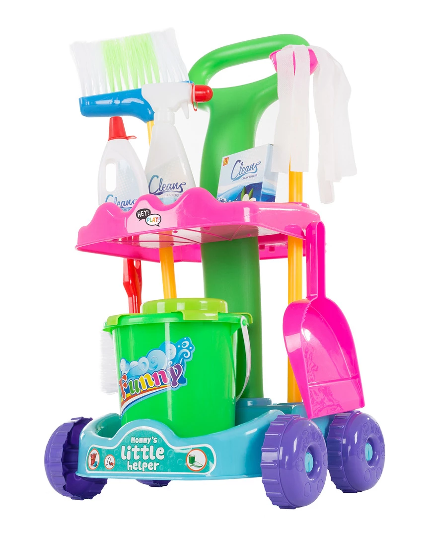 - The Pretend Play Cleaning Set and Caddy on Wheels by Hey! Play! gives kids all the housekeeping tools they need to help Mom and Dad clean. Sized just right each set comes with nine cleaning accessories and a convenient caddy on wheels to easily store them all including a mop and bucket broom brush and dust pan and pretend cleaning agents. There are even special hooks and holes so the accessories fit perfectly in the caddy. The next time you clean the house let your little one help out!