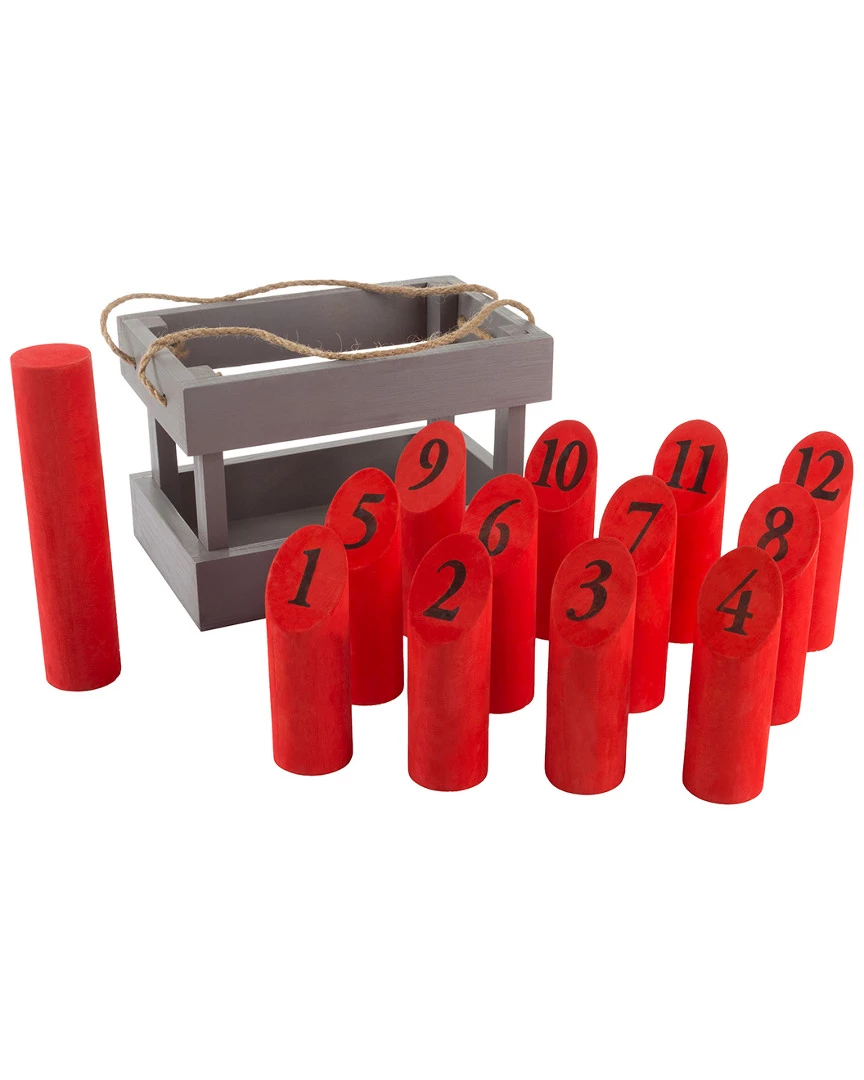 - The Hey! Play! Wooden Throwing Game is an exciting Finnish throwing game that is quickly gaining popularity in the US. It can be played on grass, gravel, sand, dirt, or just about any surface, and can be played by players of any age, making it great for the whole family. Based on a combination of chance and throwing accuracy, players use a throwing dowel to try to knock over numbered skittles (wooden pins numbered 1-12) to reach exactly 50 points. The throwing dowel and all 12 skittles are hand-crafted out of pine wood, and the set includes a wooden carrying crate with rope handles for easy transport and storage.
