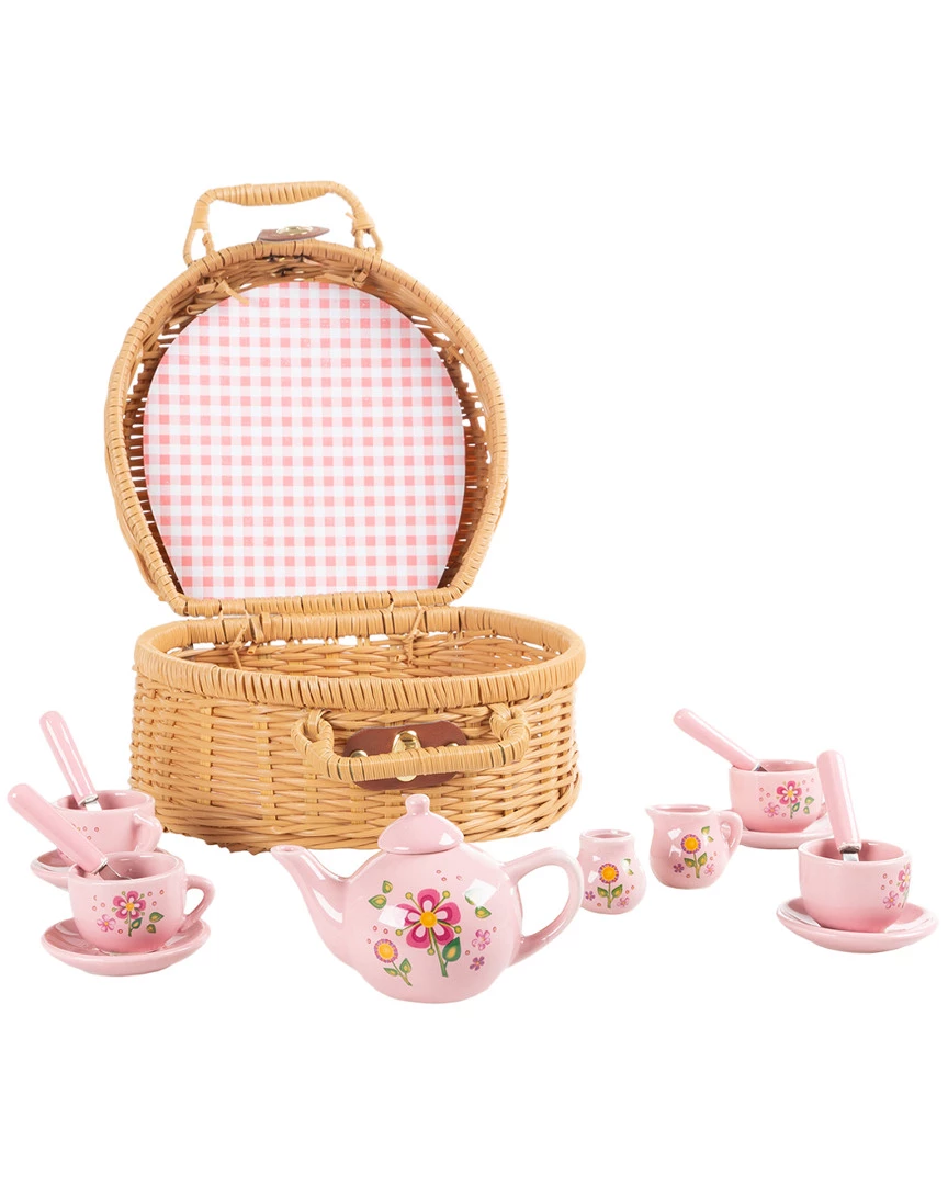 - The Mini Tea Set by Hey! Play! is a fun, engaging toy that your child is sure to love! The 17-piece set is perfectly sized for your little one to use with dolls or stuffed animals; great for mini tea parties! The porcelain tea set comes fully equipped with 4 place settings including tea cups, teapot, saucers, spoons, cream pot, sugar dish and an adorable little picnic basket case to neatly store everything! The wicker basket also has a secure latch and carrying handles for easy travel and cleanup. The tea set encourages creativity and imagition and is fantastic for pretend play activities. Your little prince or princess will have hours of fun with this beautifully crafted playset!