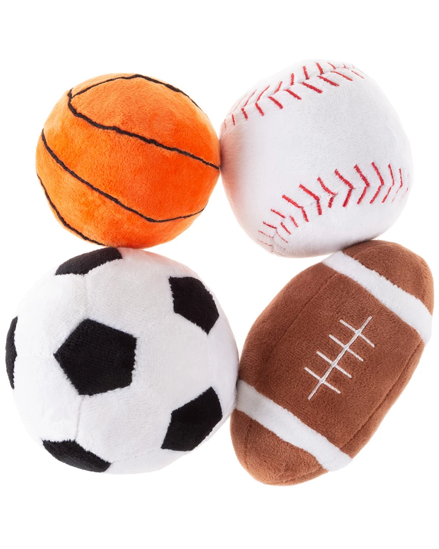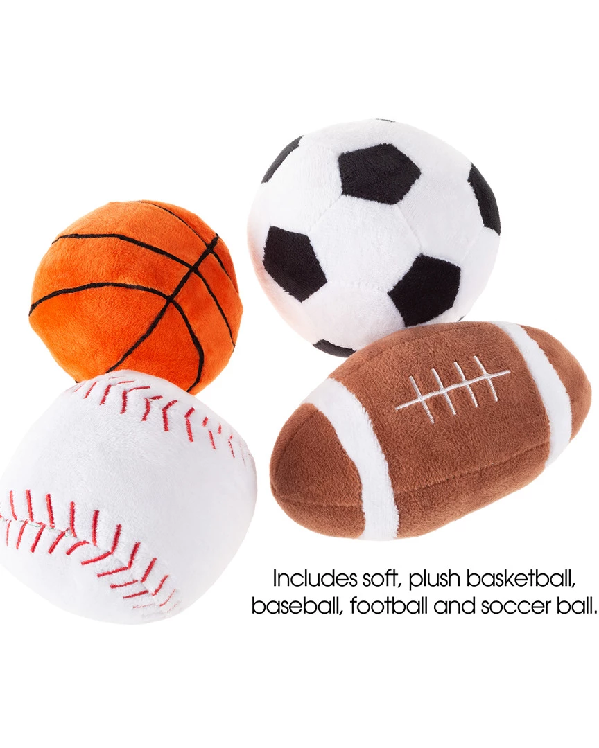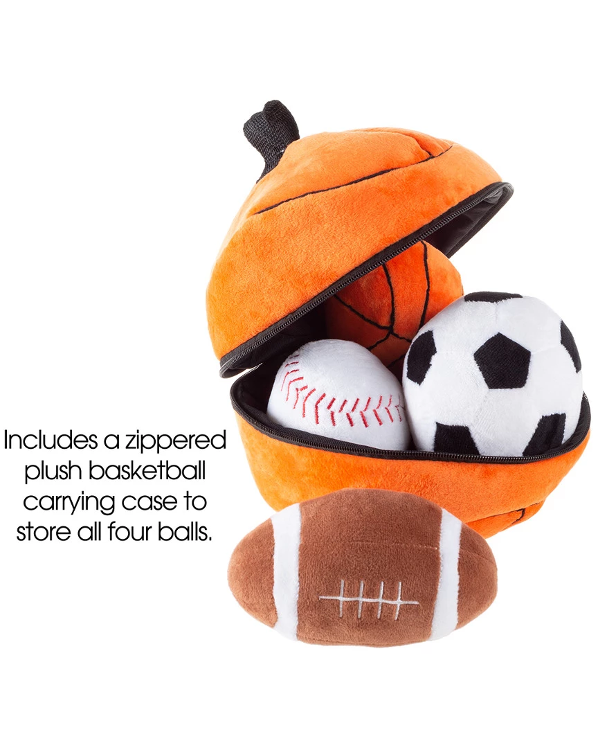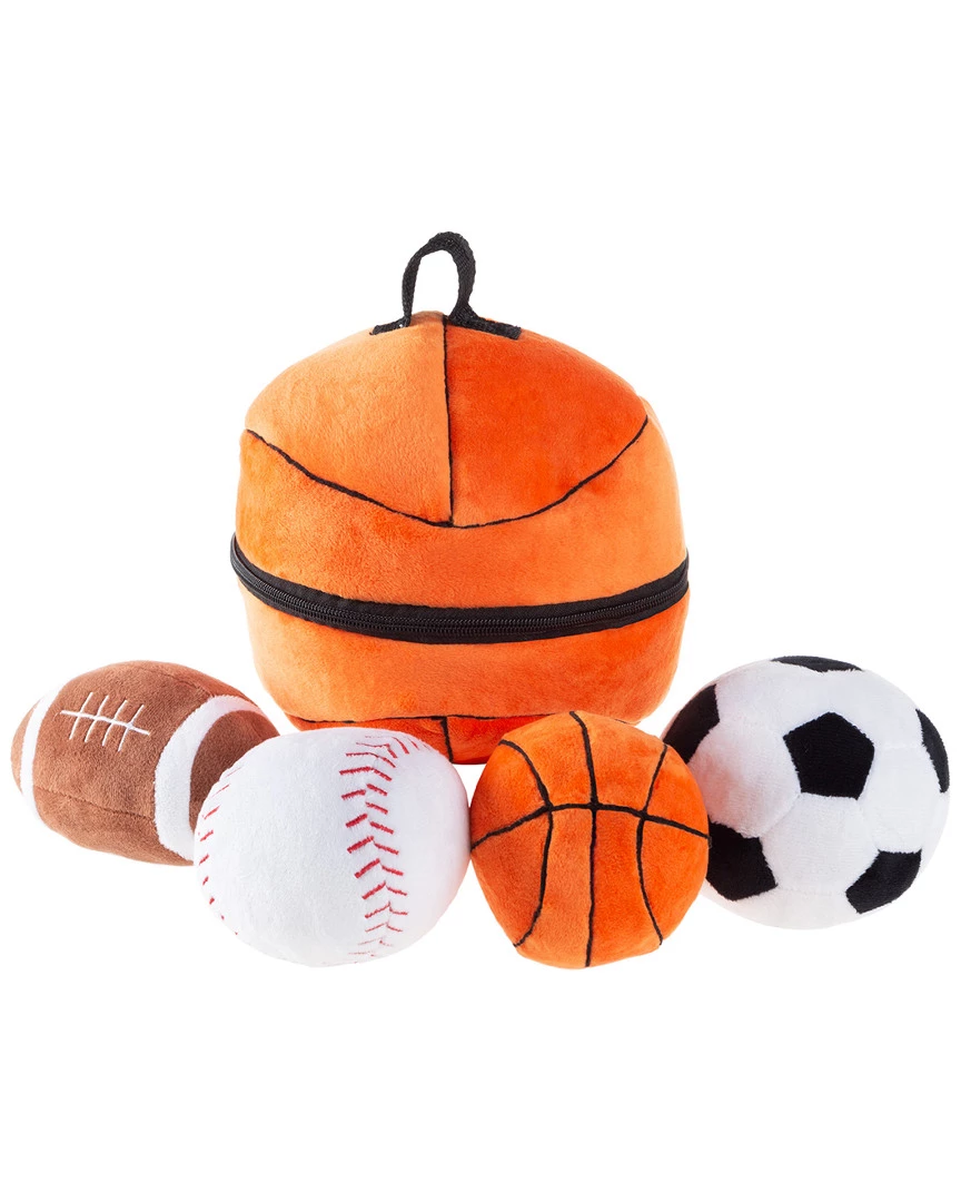 - The My First Sports Bag Playset by Hey! Play! will make a great gift for your child, loved one or a future all-star. The plush basketball, baseball, football and soccer ball set is a fun introduction to sports for young children and comes with a convenient zippered storage case thats shaped like a basketball. Each of the stuffed toys has a realistic shape to help babies and toddlers recognize balls from different sports. This huggable playset is ideal for young children that need something to snuggle yet is safe for indoor use when they are ready to hike, pass or throw!