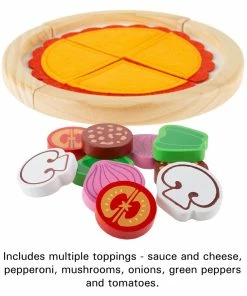 - The Pretend Play Pizza Set by Hey! Play! is a fun and engaging toy that your child is sure to love! Made of sturdy wood and equipped with hook and loop fasteners so the food pieces can be pulled or cut apart, this set is a fantastic addition to any play kitchen. With a wooden pizza board, cutter, 4 crust pieces, topping pieces including pepperoni, mushrooms, onions, green peppers and tomatoes, as well as sauce and cheese pieces that are made of felt, your little boy or girl will enjoy hours of fun constructing the perfect pizza with this colorful playset!