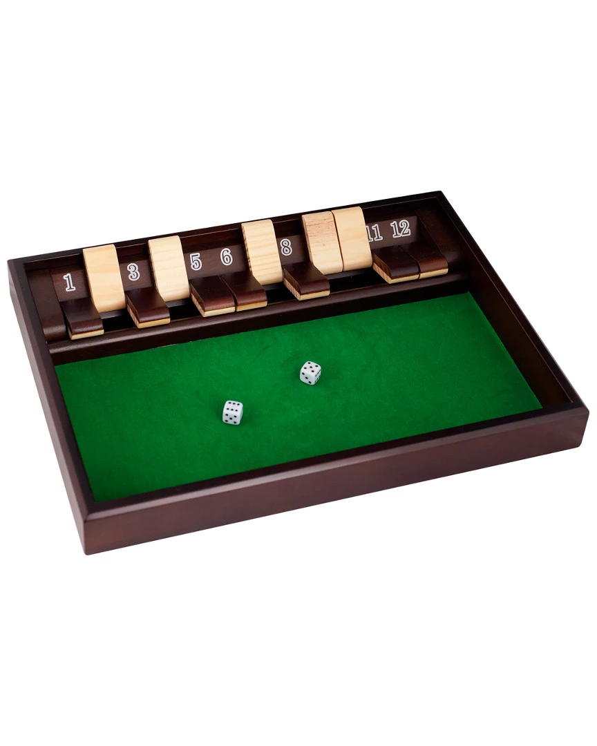 - This version of the game is called Shut the Box. It is a very solid game unit of stained finish wood and green felt and comes with complete with dice.