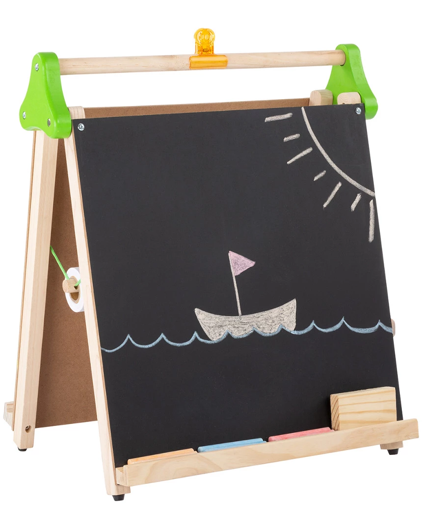 - Help your child exercise their imagition with the Three-in-One Easel by Hey! Play! This A-frame style easel has both a chalkboard and dry erase whiteboard as well as a roll of paper, allowing your child to have multiple ways to create art and use their imagitions. The easel comes with a large clip to help keep the unfurled paper in place as your or your child sketches or paints. It also comes with four pieces of colored chalk and an eraser for the chalkboard side. The easel encourages children to engage in creative play, allowing them to develop their hand-eye coordition and exercise their imagitions. The different surfaces allow children to practice writing their letters and numbers and to recognize colors as they appear on different backgrounds. The frame is made of durable pine wood making it tough enough to stand up to use at home, in daycares or in classrooms. The short stature of the A-frame makes this easel perfect for use on a table top for easy creativity.