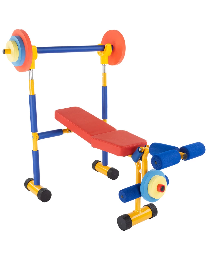 - Show your kids how fun exercise can be with the Toy Bench and Leg Press by Hey! Play! This pretend weightlifting bench is made to teach boys and girls proper form when exercising without risking strain or injury from heavy, adult-sized equipment. Both the barbell and bench frame are made of sturdy, powder coated steel and wrapped in protective foam to stand up to daily use and provide comfort. The foam weights on the barbell are removeable to provide a customized look. Not only is this bench a great way to introduce children to exercise, but it also provides a fun way to learn how different muscles move and how the body works. The barbell rack is adjustable, so it can grow with your child as they continue to learn about exercise and healthy living through play. The bench has a 150-pound weight limit.