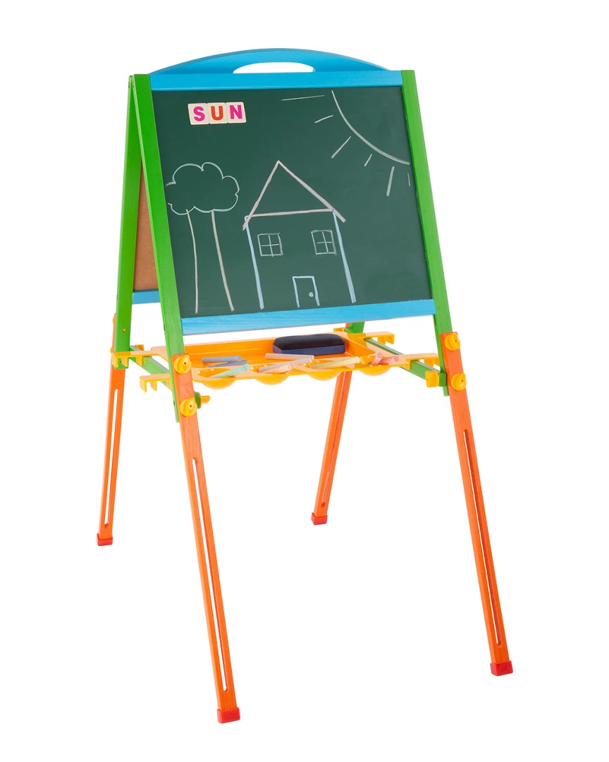 - Help your child exercise their imagition with the Two-Sided Easel by Hey! Play! This A-frame style easel has both a chalkboard and dry erase whiteboard, allowing your child to have multiple ways to create art and use their imagitions. Both boards are magnetic, so kids can practice letter and number recognition as well as basic spelling and math with the included letter, number and math symbol magnets. They also help children develop hand-eye coordition and encourages creative play. The legs of the easel are adjustable, so kids of all sizes can continue to create and learn. The frame is made of durable, hand-painted wood making it tough enough to stand up to use at home, in daycares or in classrooms. The easel comes with colored chalk and an eraser, as well as a tray to hold the included magnets or other art supplies you may have.