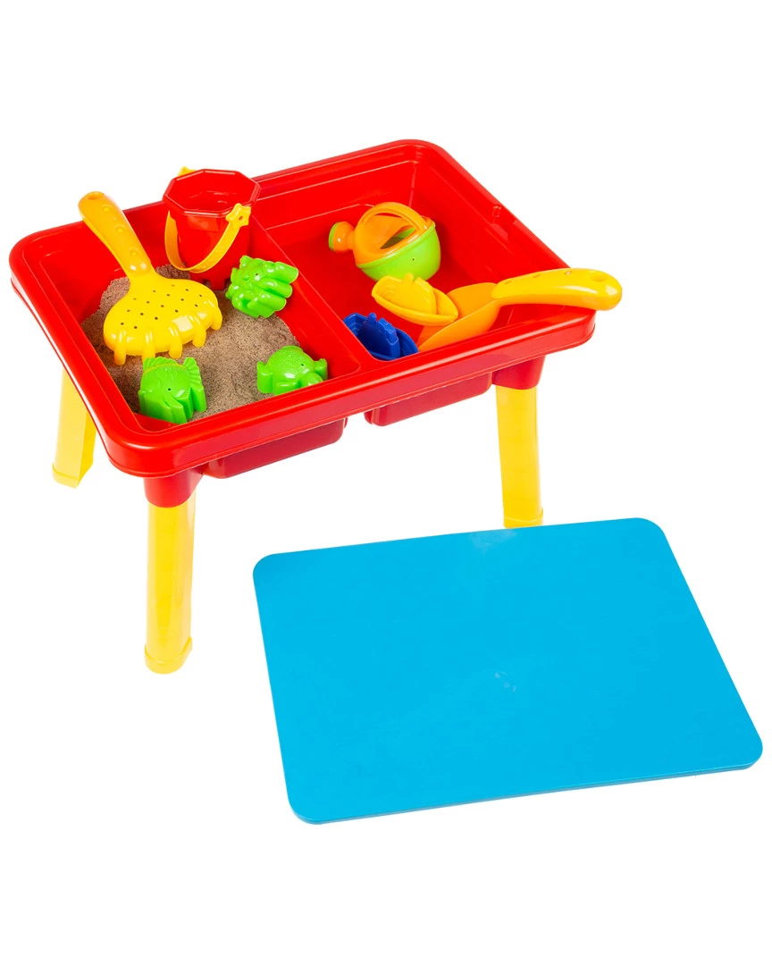 - Your little ones will have hours of fun with the Sand and Water Sensory Table by Hey! Play! This versatile table has two wells that you can fill with either regular or kinetic sand, water or both! It also comes with a lid to protect the fill sand or water when the table is not in use and to store the included tools during travel. The included toys will help your children develop their fine motor skills as they build sand sculptures and use the pail, shovel and pail. You can also help them develop their problem-solving skills by burying the crab, turtle and fish shapes for a treasure hunt. The little boats can teach them storytelling as they pretend to be pirates or ship captains. The durable plastic construction makes this sensory table great not only for home use, but for daycare centers and special needs classrooms for children with sensory issues. Measuring just 17long, 12wide and 11 tall, this table can easily fit into the trunk or backseat of a car, van or truck to take to the beach for extra fun in the sun!