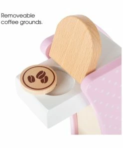 - Your child is sure to enjoy hours of pretend play fun with the Toy Coffee Maker by Hey! Play! This fun set comes complete with a wooden single serve coffee brewer, removable coffee grounds, a small mug, and it even has an adjustable side knob to set how hot the coffee is just like a real espresso or cappuccino machine. Made of wood and painted light pink and white, this charming coffee toy set makes a wonderful addition to a play kitchen that your little boy or girl will love!