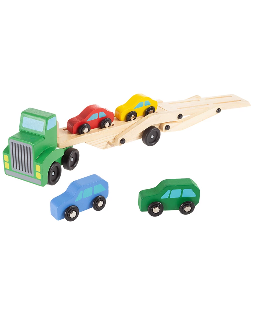 - The Wooden Transport Truck by Hey! Play! is a fun and classic toy that your child will love! The set comes complete with a semi-truck with a two-tiered loader trailer, and 4 colorful cars to transport. Constructed from sturdy high-quality Pine wood, this truck will survive years of wear and tear. This simple, classic toy is wonderful for pretend play and will spark imagition and creativity in your little girl or boy; your kids will love this truck and car set for years to come!
